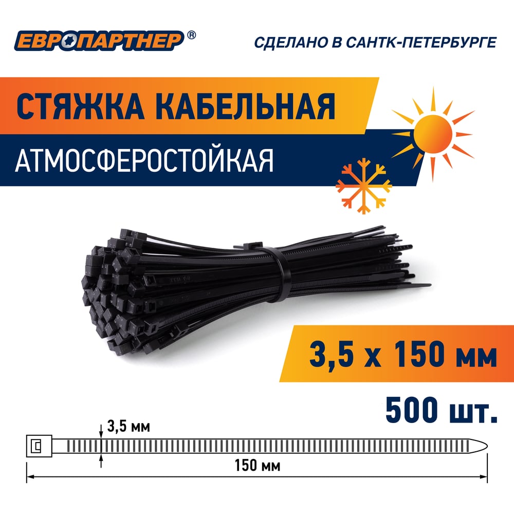Кабельная нейлоновая стяжка ЕВРОПАРТНЕР PRNS 150x3.5 черная атмосферостойкая, 500 шт. 76062457