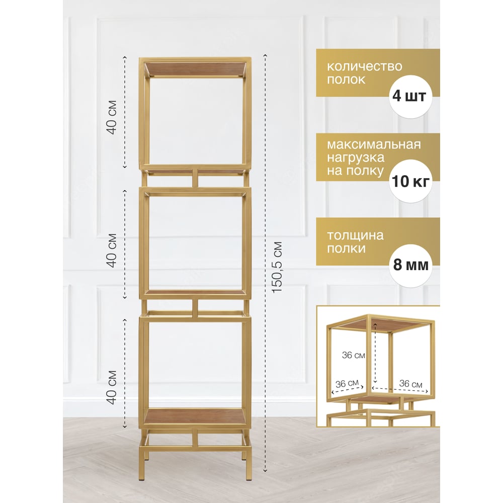 Стеллаж GreenWeen CUBIC-3, золотой каркас, полки ЛДСП Робиния, 1505x400x400 GW-CUBIC-3-G-LD-R