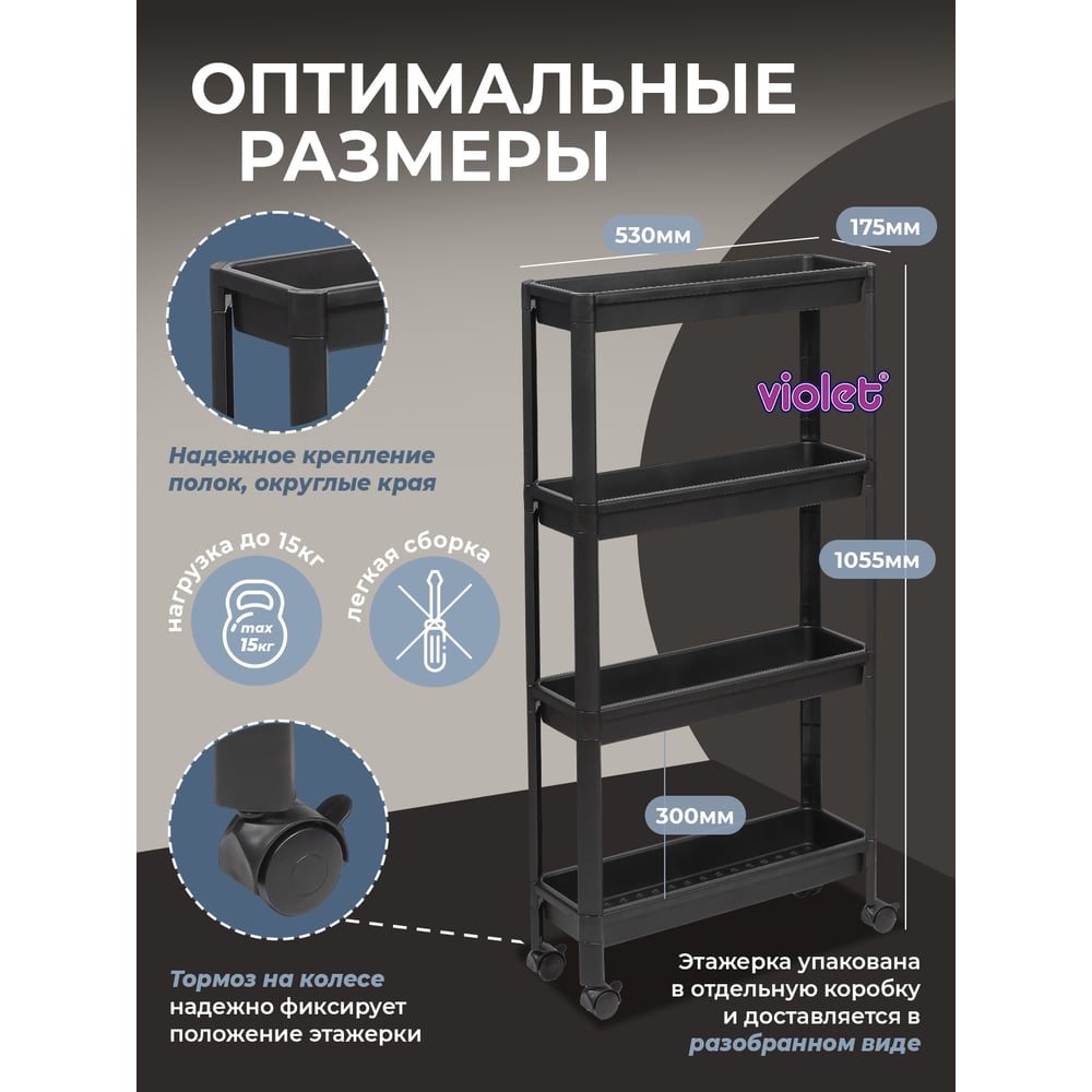 Этажерка Violet VIKEA узкая, 4-х ярусная, на колесах, черная 782407