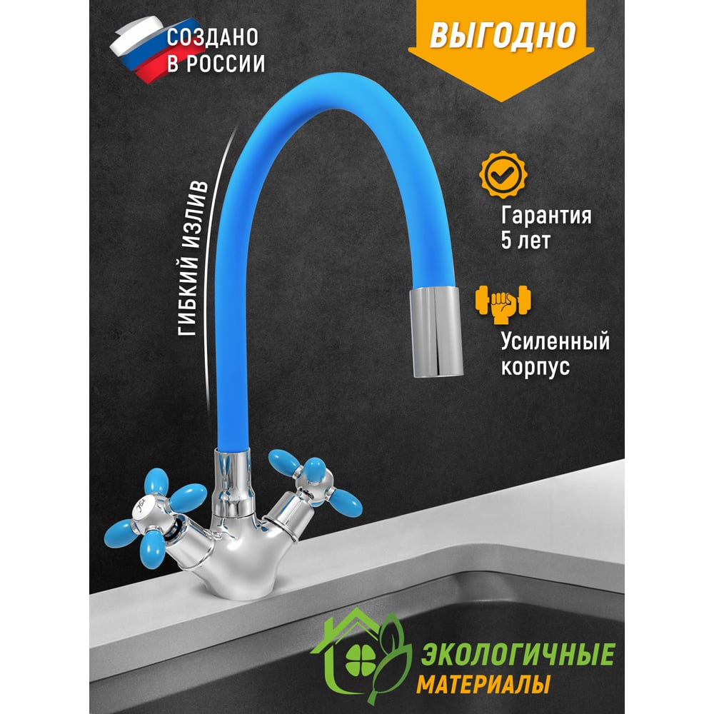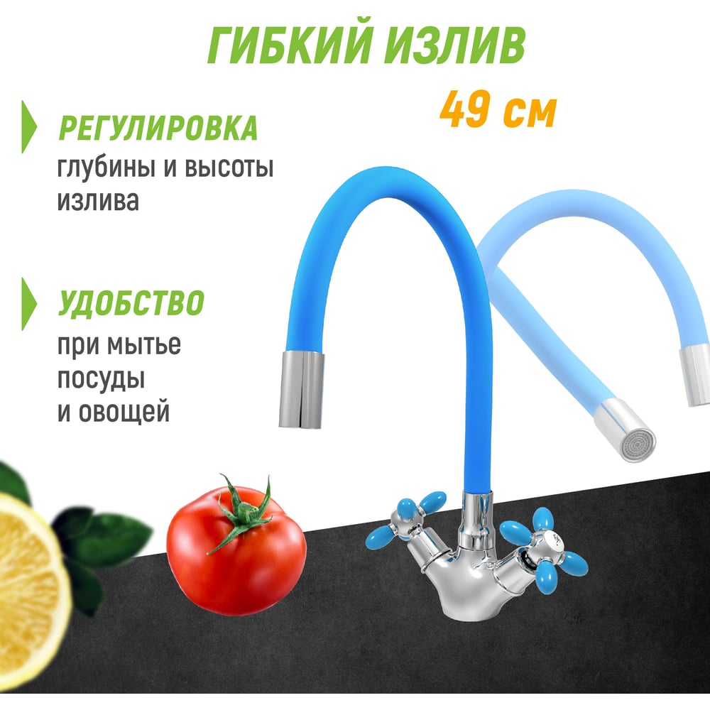 Смеситель для мойки Juguni двуручный с гибким силиконовым изливом (синий), креп. гайка, 0402.144