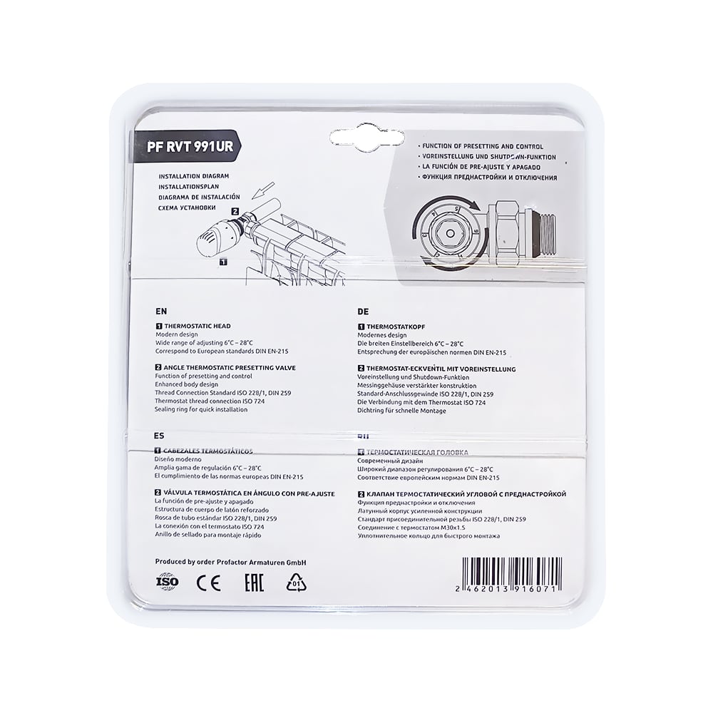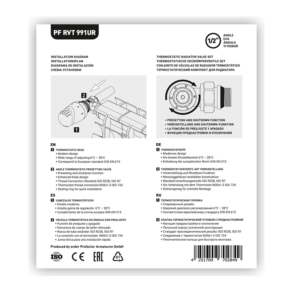 Комплект радиатора PROFACTOR термостатический, угловой, с преднастройкой и уплотнением, 1/2 PF RVT 991UR