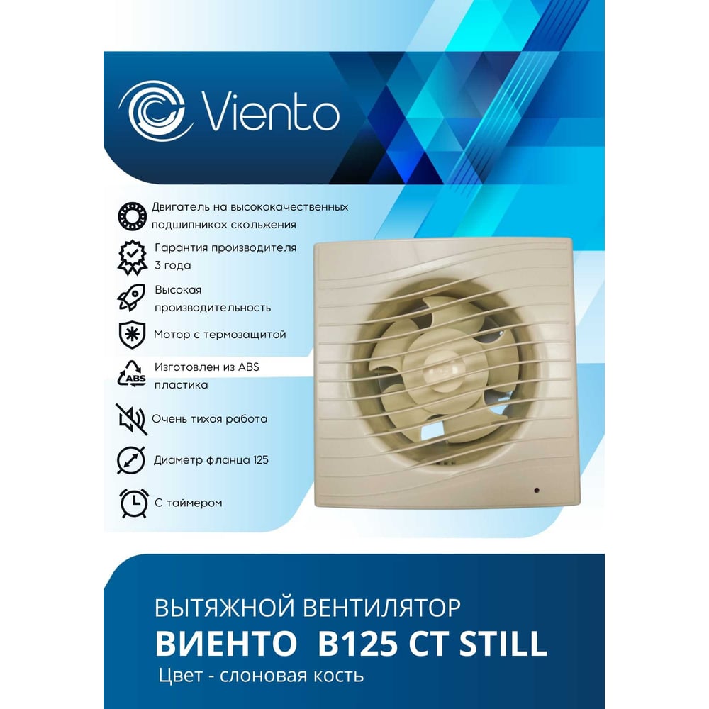 Осевой вытяжной вентилятор ВИЕНТО с таймером, малошумный, 240 м3, ВОЛНА, сл. кость, шарикоподшипник ВИЕНТО В125СТ STILL ivory-B