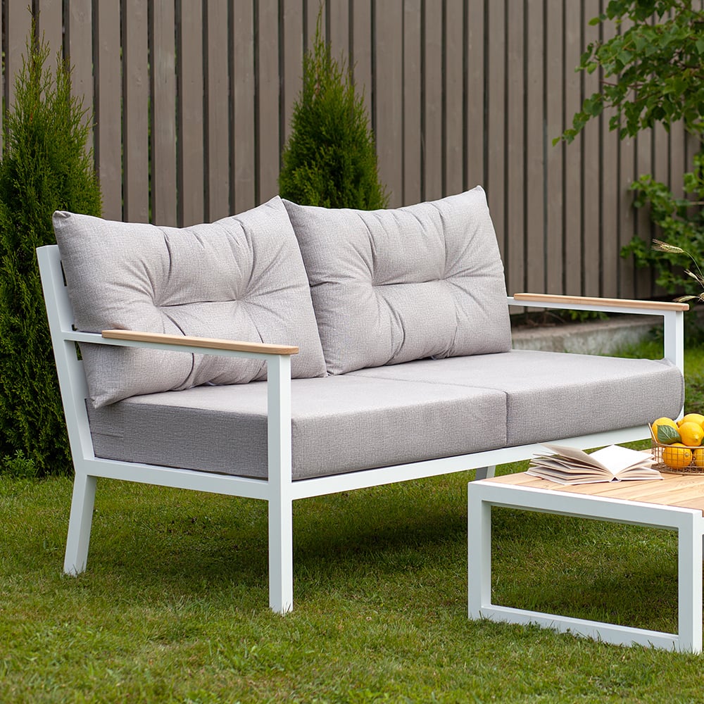 Уличный диван GreenWeen SANTORINI c подушками из велюра светло-серого цвета, белый каркас из алюминия, 1800x870x820 мм GW-AL-SANT-SOFA-1800W