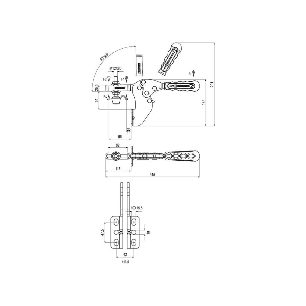 Прижим горизонтальный с угловым основанием KUKAMET, усилие 510 кг 113-5