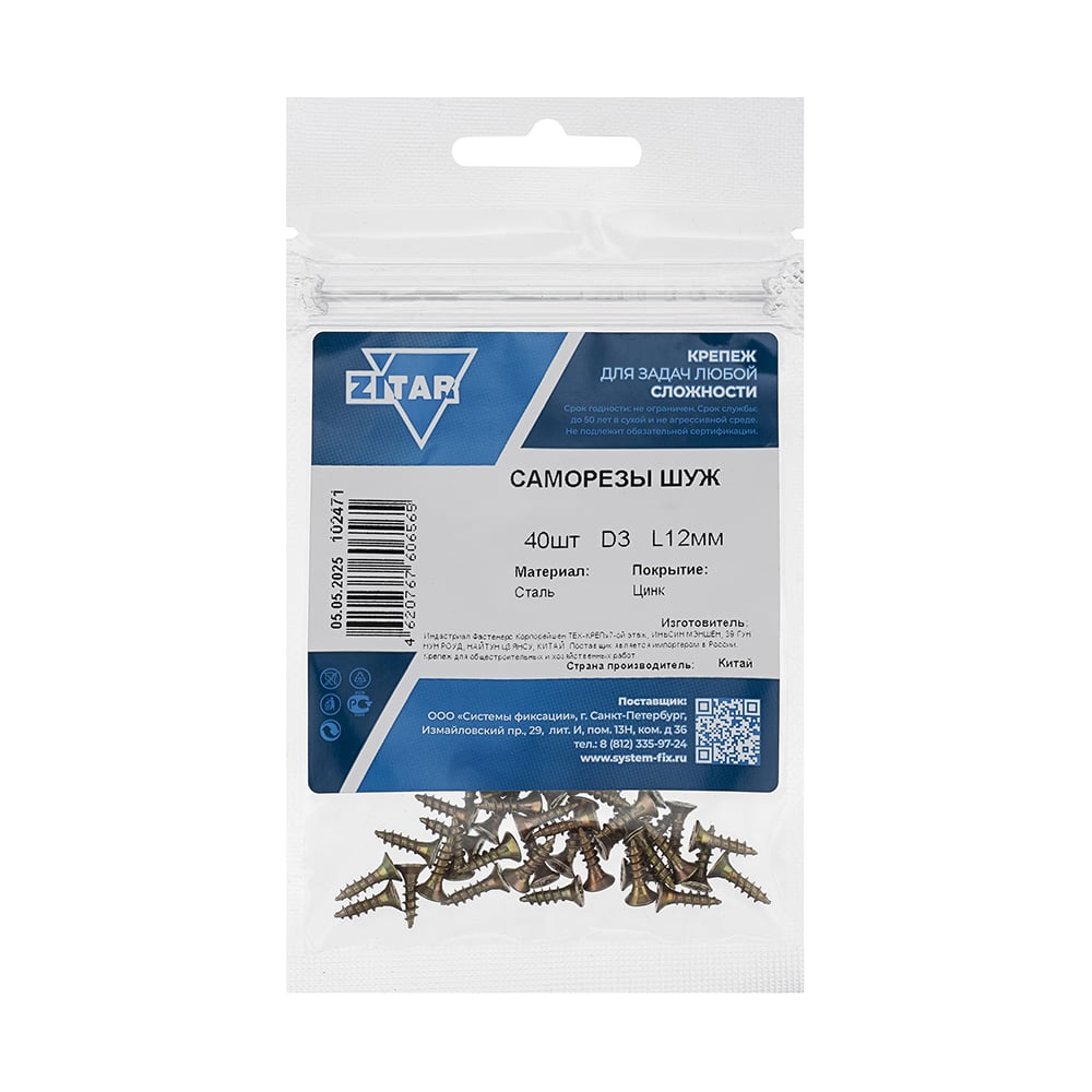 Саморез ШУж 3,0х12 потайная головка 40 шт, пакет Zitar 102471