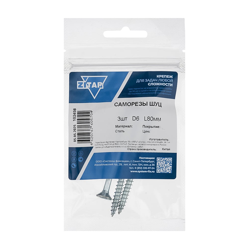Саморез ШУц с потайной головкой 6,0x80 мм, 3 шт., пакет Zitar 102458