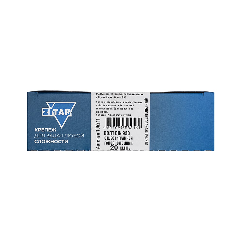 Болт DIN933 с шестигранной головкой оцинкованный М8x50 мм, 20 шт, коробка с окном Zitar 105211