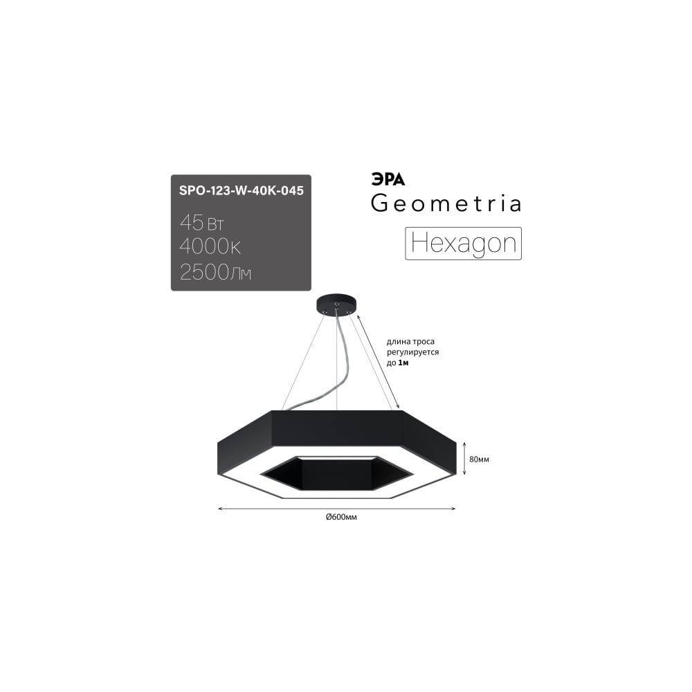 Подвесной светильник LED ЭРА Geometria Hexagon SPO123B40K045 45Вт, 4000K 2500Лм, IP40, 600х80, черный, драйвер Б0058879