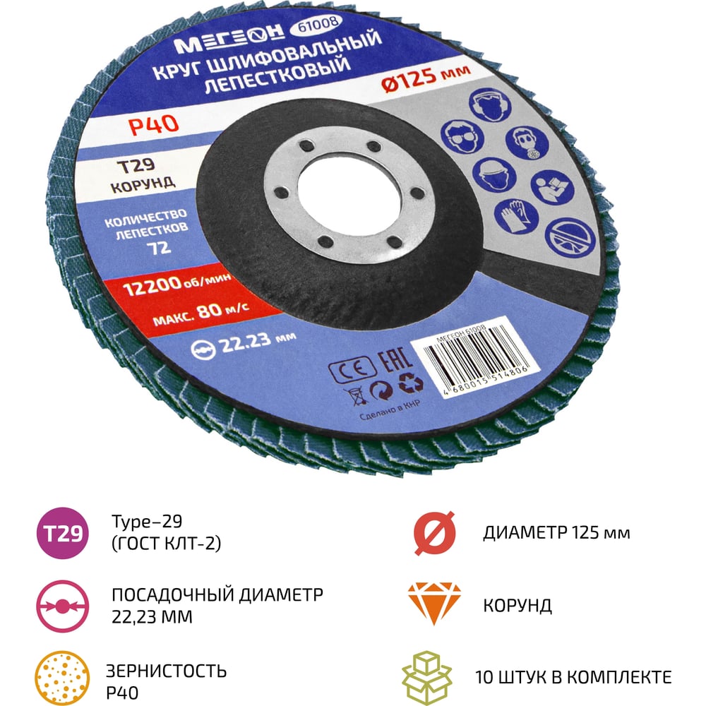 Круг шлифовальный лепестковый 125 мм, P40, 10 шт 61008-10 МЕГЕОН к0000396369