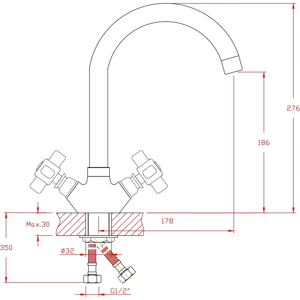 Цвет хром/белый Тип установки настольный/на раковину Стиль современный Материал корпуса цинк Поворотный излив да Назначение для кухни Тип крепления на гайку Гибкий излив нет Длина излива 178 мм Высота смесителя 276 мм Лейка нет Термостат нет Встраиваемый нет Подводка в комплекте нет Аэратор да Переключатель на фильтр нет Тип смесителя двухрычажный Форма излива воды традиционная Запорный клапан керамическая кран-букса Форма смесителя округлая Выдвижной излив нет Излив есть Складной нет С щеткой нет Двойной излив нет Диаметр картриджа нет мм Размер крепления G1/2 Направление струи вертикальное Диаметр отверстия в раковине 32 мм Форма маховиков крестик ГОСТ/DIN нет Высота излива 186 мм Мах толщина столешницы 30 мм Расположение термостата без термостата