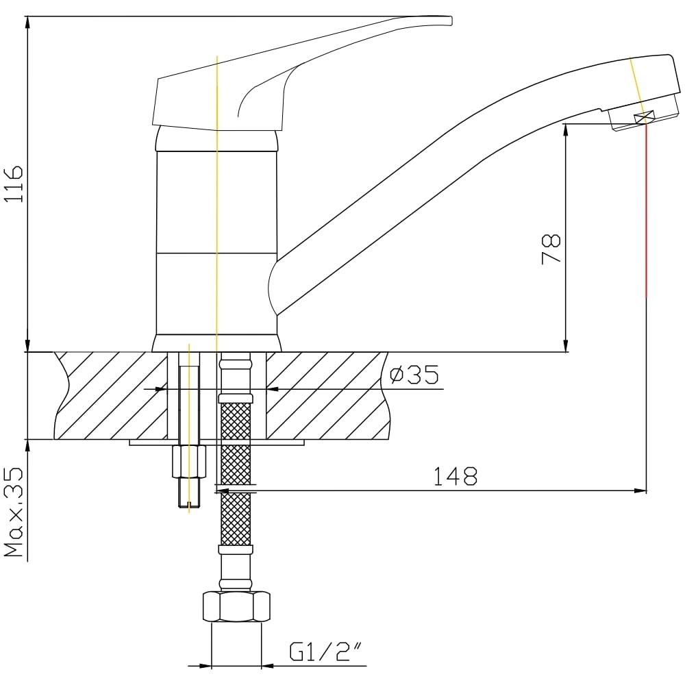 Покрытие глянцевое Цвет хром Тип установки настольный/на раковину Стиль современный Материал корпуса цинк Поворотный излив да Назначение для кухни Тип крепления на шпильку Гибкий излив нет Длина излива 148 мм Высота смесителя 116 мм Лейка нет Термостат нет Встраиваемый нет Подводка в комплекте нет Аэратор да Переключатель на фильтр нет Тип смесителя однорычажный Форма излива воды традиционная Запорный клапан керамический картридж Форма смесителя плоская Выдвижной излив нет Излив есть Складной нет С щеткой нет Двойной излив нет Диаметр картриджа 35 мм Размер крепления G1/2 Направление струи вертикальное Диаметр отверстия в раковине 35 мм ГОСТ/DIN нет Высота излива 78 мм Мах толщина столешницы 35 мм Расположение рычага сверху Расположение термостата без термостата
