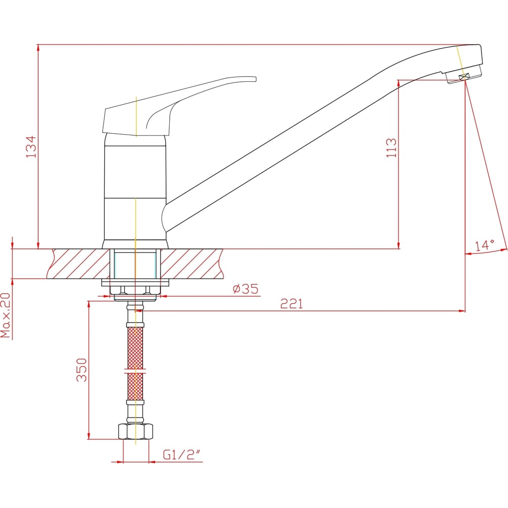 Покрытие глянцевое Цвет хром Тип установки настольный/на раковину Стиль современный Материал корпуса цинк Поворотный излив да Назначение для кухни Тип крепления на шпильку Гибкий излив нет Длина излива 221 мм Высота смесителя 134 мм Лейка нет Термостат нет Встраиваемый нет Подводка в комплекте нет Аэратор да Переключатель на фильтр нет Тип смесителя однорычажный Форма излива воды традиционная Запорный клапан керамический картридж Форма смесителя плоская Выдвижной излив нет Излив есть Складной нет С щеткой нет Двойной излив нет Диаметр картриджа 35 мм Размер крепления G1/2 Направление струи вертикальное Диаметр отверстия в раковине 35 мм ГОСТ/DIN нет Высота излива 113 мм Мах толщина столешницы 20 мм Расположение рычага сверху Расположение термостата без термостата