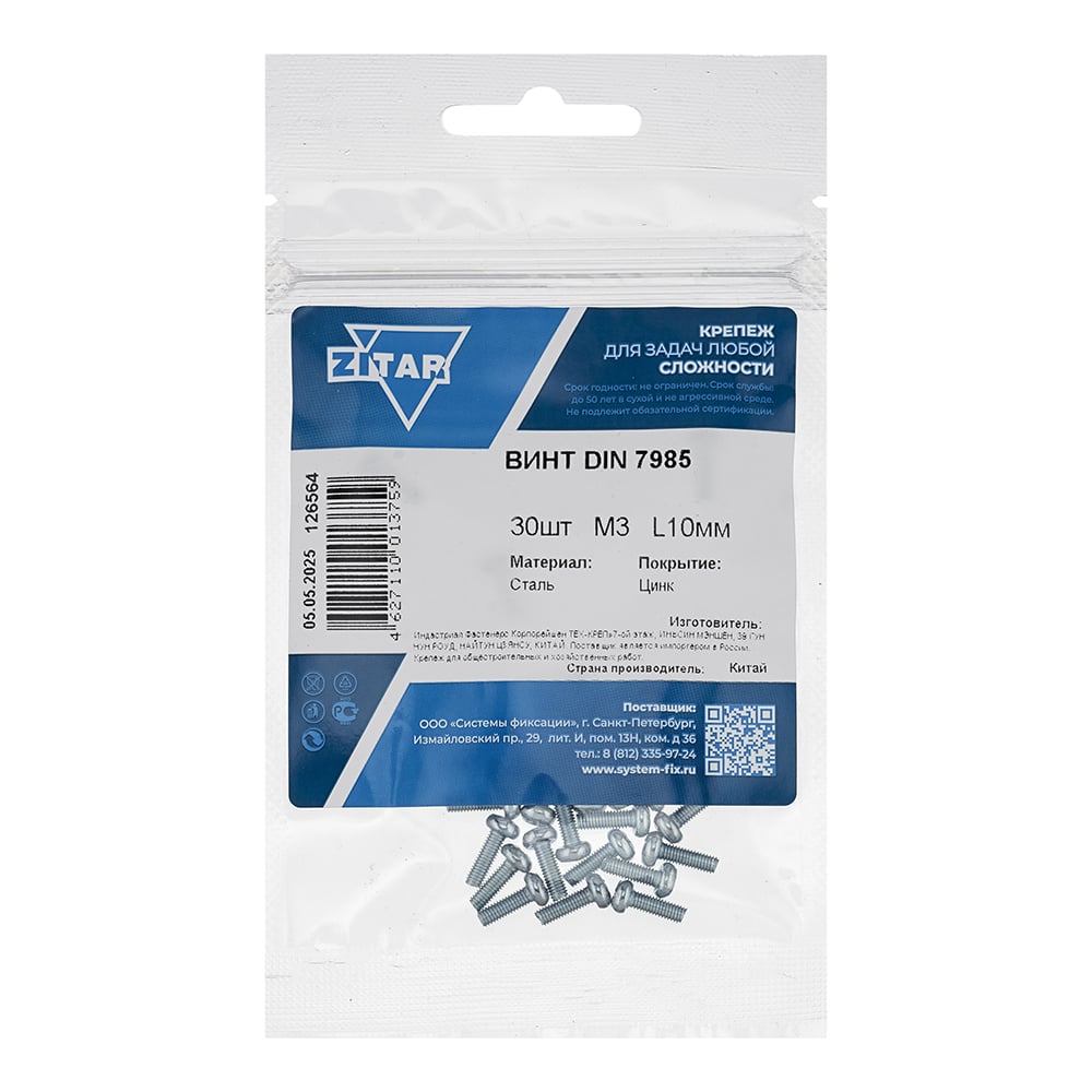 Винт Zitar DIN7985 с полукруглой головкой оцинкованный М3x10, 30 шт. (пакет) 126564