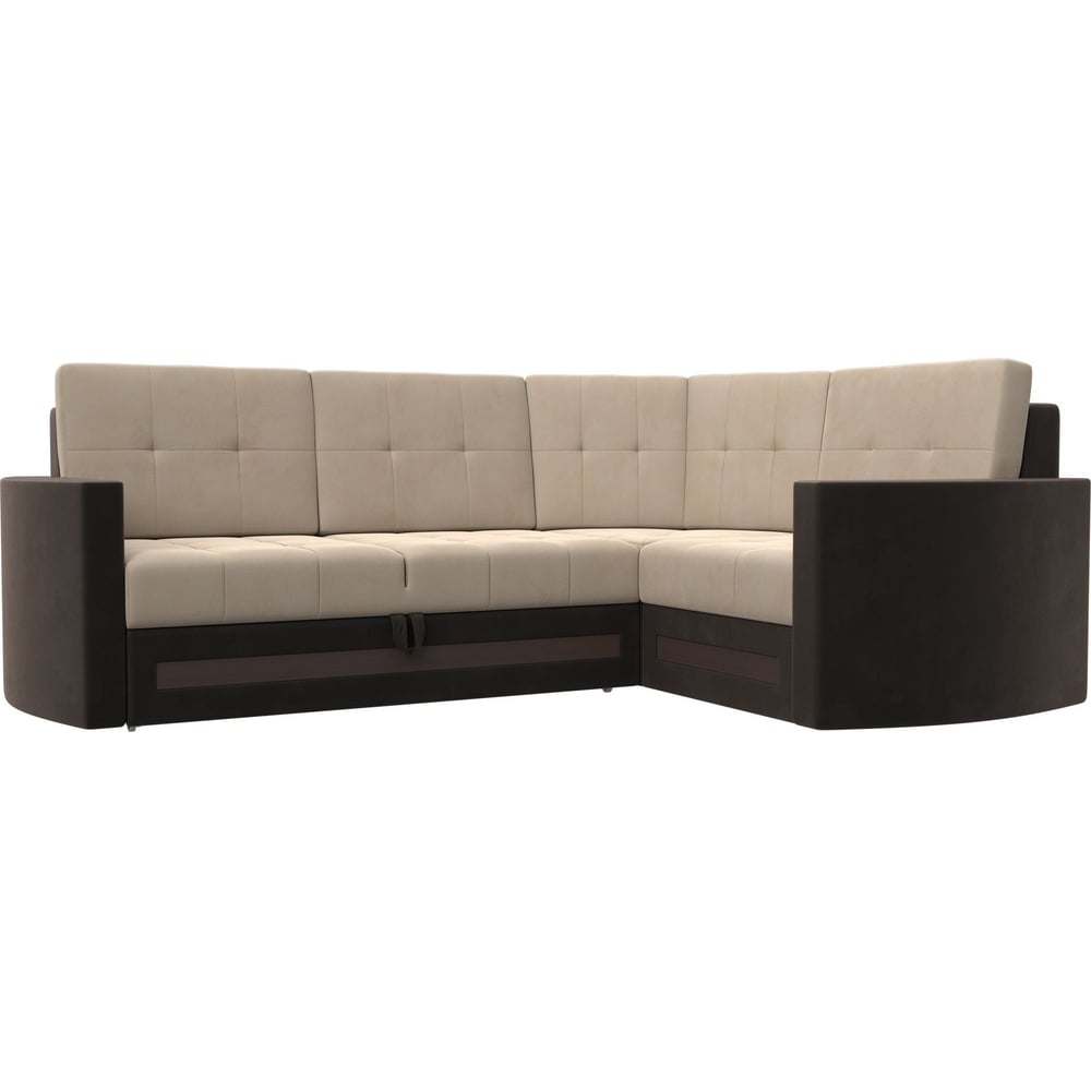 Габариты без упаковки 2330х900х1690 мм Высота 900 мм Длина 2330 мм Ширина 1690 мм Цвет бежевый/коричневый Вес нетто 125 кг Стиль современный Форма с правым углом Наполнитель ППУ, резинотканевые ремни Подлокотники есть Max нагрузка 165 кг Высота спинки 800 мм Материал обивки велюр Палитра бежевый Материал ножек пластик Цвет ножек черный Высота сиденья 420 мм Материал каркаса ДСП, ЛДСП, Брус Раскладной есть Ножки есть Количество спальных мест 1.5 Длина спального места в разложенном виде 1960 мм Ширина спального места в разложенном виде 1320 мм Полки нет Ящик для белья есть Механизм трансформации дельфин Модульный нет