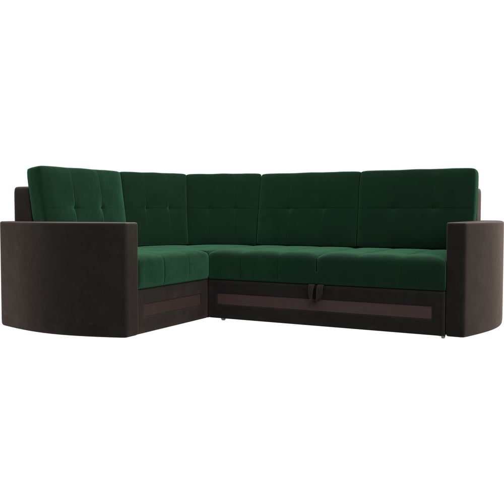 Габариты без упаковки 2330х900х1690 мм Высота 900 мм Длина 2330 мм Ширина 1690 мм Цвет зеленый/коричневый Вес нетто 125 кг Стиль современный Форма с левым углом Наполнитель ППУ, резинотканевые ремни Подлокотники есть Max нагрузка 150 кг Высота спинки 800 мм Материал обивки велюр Палитра зеленый Материал ножек пластик Цвет ножек черный Высота сиденья 420 мм Материал каркаса ДСП, ЛДСП, Брус Раскладной есть Ножки есть Количество спальных мест 1.5 Длина спального места в разложенном виде 1960 мм Ширина спального места в разложенном виде 1320 мм Полки нет Ящик для белья есть Механизм трансформации дельфин Модульный нет