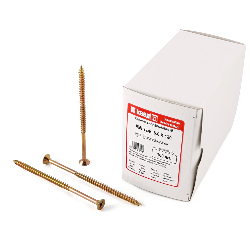 Универсальный саморез Квадра 6x120 желтый, потайная голова, цинк, кop. 100 шт. 604120010100