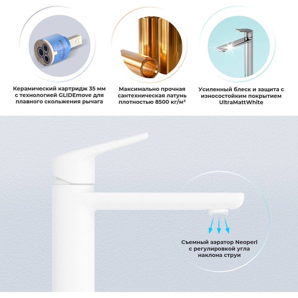 Покрытие матовое Цвет белый Тип установки на раковину Стиль современный Материал корпуса латунь Серия ICON for life Поворотный излив нет Назначение для умывальника Тип крепления монтаж в стену Подсветка нет Порционный нет Гигиенический душ (комплект) нет Гибкий излив нет Донный клапан да Педальный смеситель нет Перелив в комплекте нет Для раковины чаши нет Длина излива 135 мм Высота смесителя 175 мм Лейка нет Встроенная сушка нет Термостат нет С выходом под гигиенический душ нет Встраиваемый нет Подводка в комплекте гибкая Аэратор да Переключатель на фильтр нет Тип смесителя однорычажный Количество монтажных отверстий 1 шт Форма излива воды традиционная Запорный клапан керамический картридж Присоединительный размер 3/8 дюйма Форма смесителя плоская Выдвижной излив нет Излив есть Диаметр отверстия в раковине 35 мм ГОСТ/DIN нет Высота излива 100 мм Локтевой (хирургический) нет Расположение термостата без термостата
