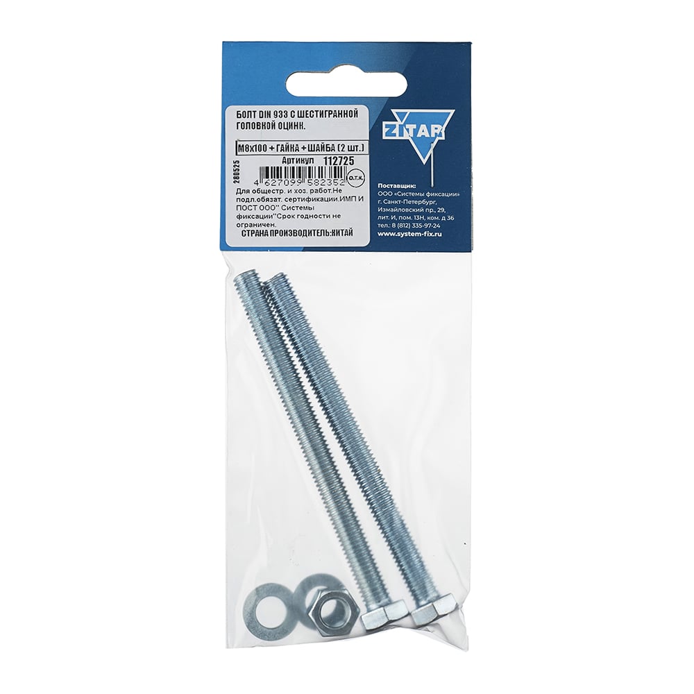 Болт с шестигранной головкой DIN933 оцинкованный М8x100 мм, в комплекте с гайкой и шайбой, 2 шт в пакете Zitar 112725