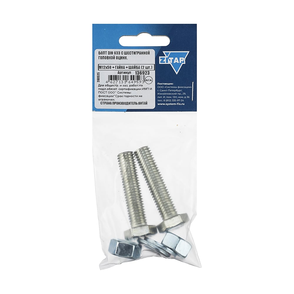 Болт с шестигранной головкой оцинкованный Zitar DIN933 М12x50 + гайка + шайба 2 шт - пакет 136923