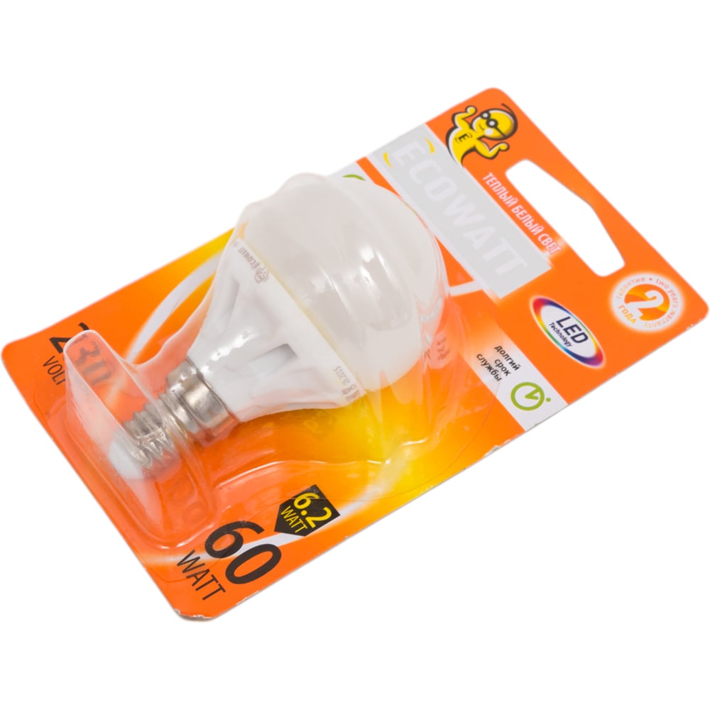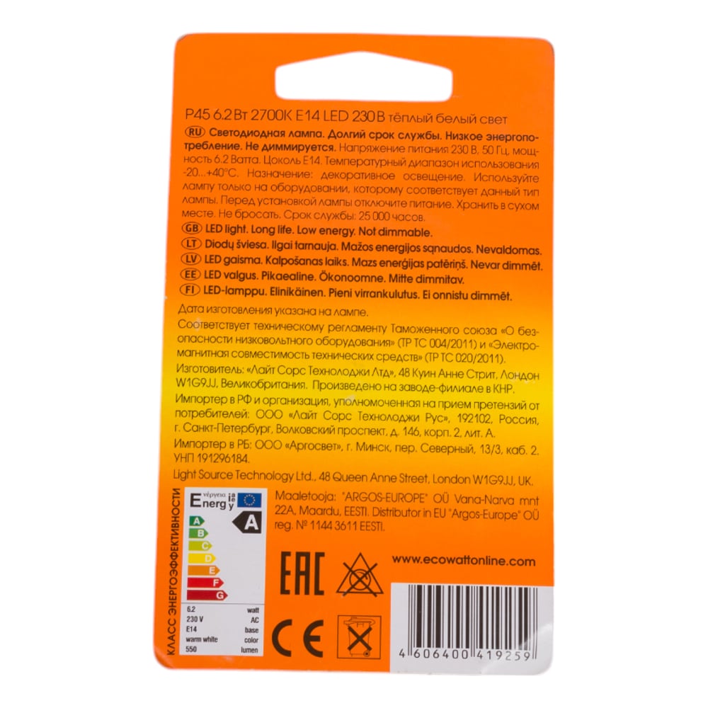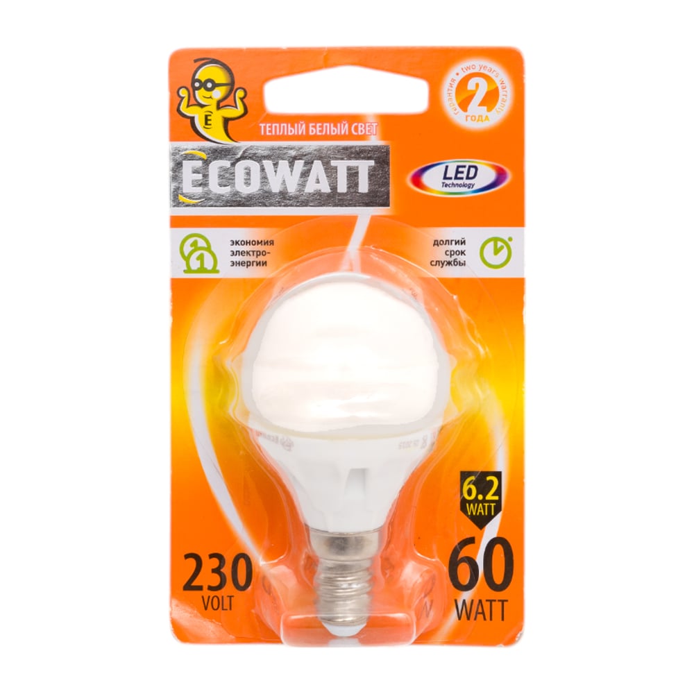 Светодиодная лампа ECOWATT P45, 230 В, аналог 60 Вт, 2700K E14 4606400419259