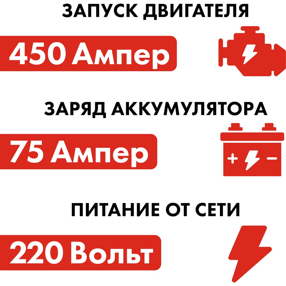Класс товара Бытовой Вес нетто 26 кг Напряжение питания 220 В Режим Boost да Зарядка щелочных аккумуляторов нет Режим десульфатации нет Min емкость аккумулятора 80 А*ч Max потребляемая мощность зарядки 1600 Вт Max ток заряда 75 А Max емкость аккумулятора 750 А*ч Max ток запуска 450 А Тип зарядки традиционная зарядка (WET, EFB) Сможет запустить мотоцикл, автомобиль, автобус, лодка, трактор, грузовик Тип устройства пуско-зарядное устройство Для аккумуляторов напряжением 12/24 В Цифровой дисплей да Тип встроенного аккумулятора не имеет встроенного аккумулятора Max потребляемая мощность запуска 10000 Вт