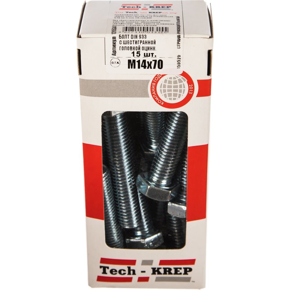 Болт DIN 933 с шестигранной головкой, оцинкованный М14х70, 15шт - коробка Tech-Krep 126534