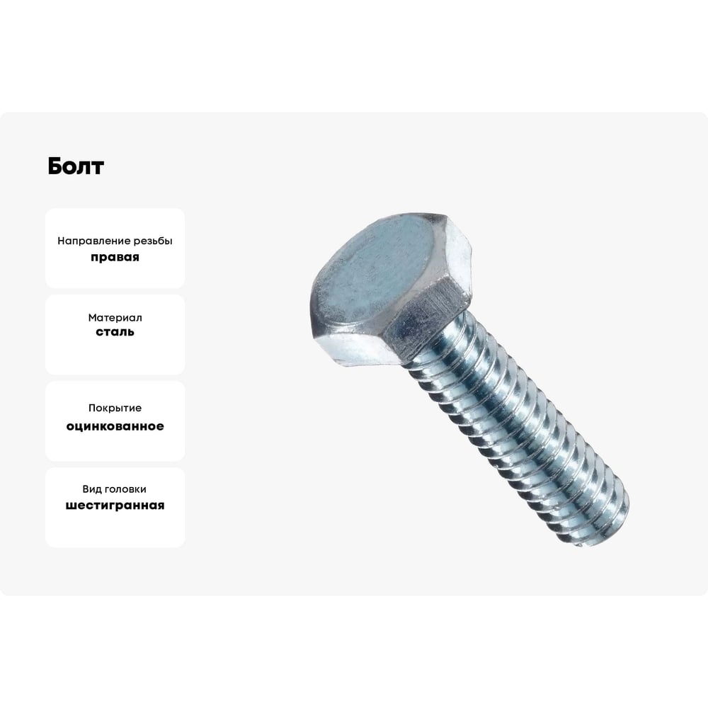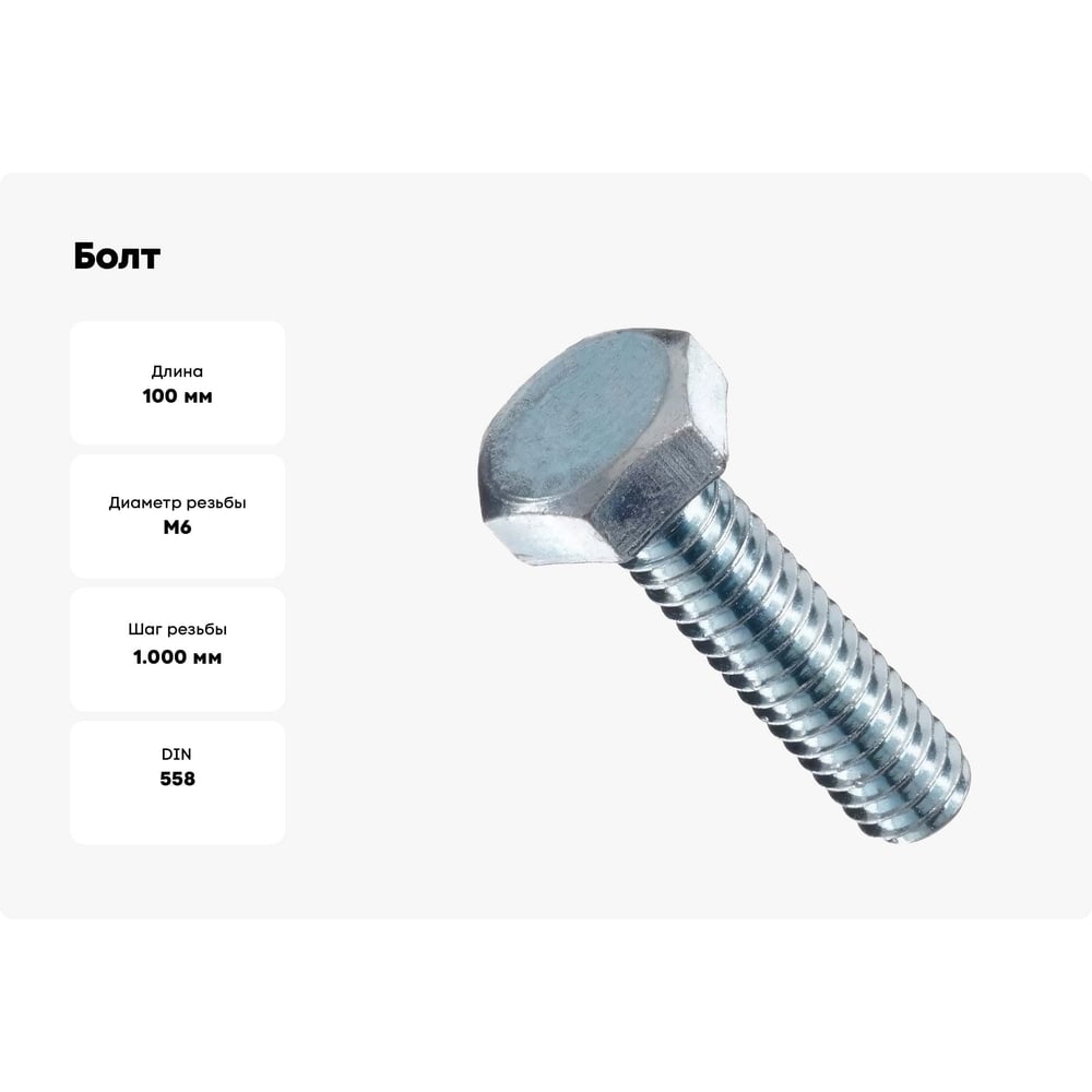Шаг резьбы 1 мм Длина 100 мм Комплектация болт Вид головки шестигранная Тип резьбы полная DIN 558 Тип фасовки шт. Класс прочности 5.8 Диаметр резьбы М6 Направление резьбы правая Материал сталь Покрытие цинк ISO 4018 ГОСТ 15589-70 Фасовка 1 кг Фасовка 90 шт
