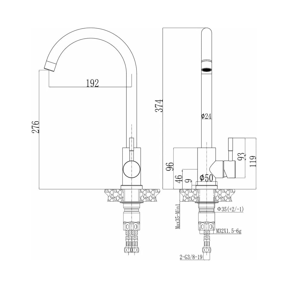 Цвет сатин Тип установки настольный/на раковину Стиль современный Материал корпуса нержавеющая сталь Серия Ломонд Поворотный излив да Назначение для кухни Тип крепления на гайку Гибкий излив нет Длина излива 192 мм Высота смесителя 374 мм Лейка нет Термостат нет Встраиваемый нет Подводка в комплекте гибкая Аэратор да Переключатель на фильтр нет Тип смесителя однорычажный Форма излива воды традиционная Запорный клапан керамический картридж Форма смесителя округлая Выдвижной излив нет Излив есть Складной нет С щеткой нет Двойной излив нет Диаметр картриджа 35 мм Размер крепления G3/8 Направление струи вертикальное Диаметр отверстия в раковине 35 мм Высота излива 276 мм Мах толщина столешницы 35 мм Расположение термостата без термостата