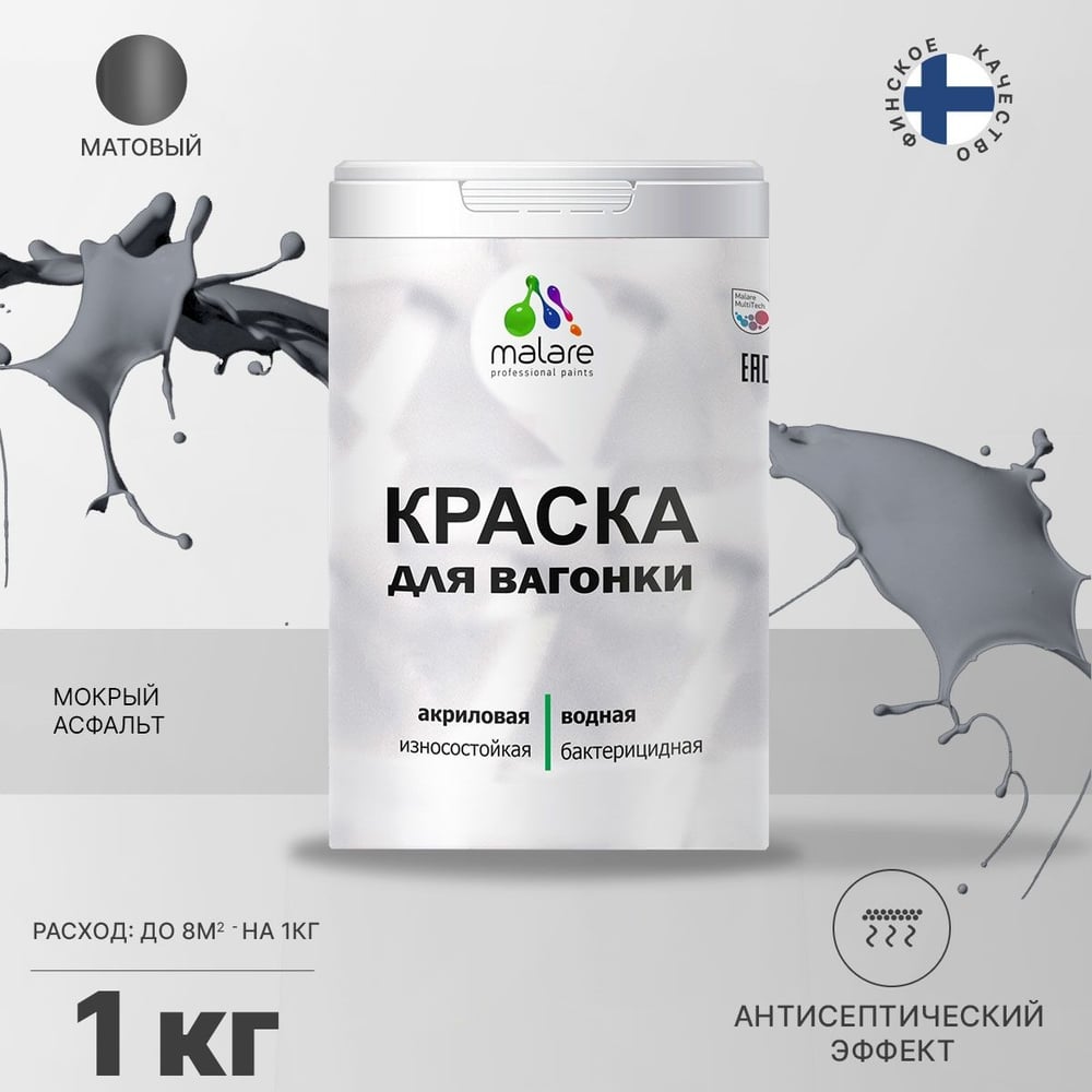 Краска MALARE для вагонки, с антисептическим эффектом, мокрый асфальт, 1 кг КВГНКАМОАМ0100