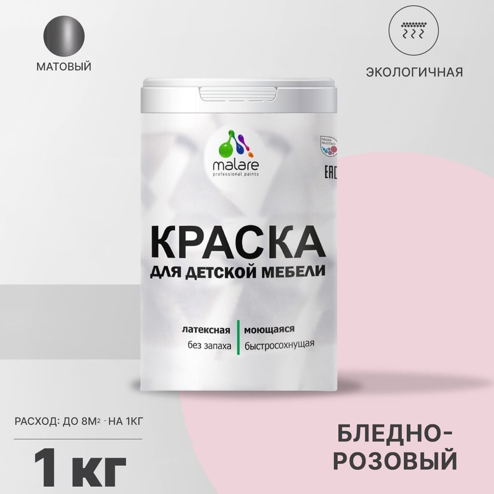 Акриловая краска MALARE для детской мебели для кухонных фасадов, мебели из дерева, моющаяся, быстросохнущая, без запаха, матовая, бледно-розовый, 1 кг. КДТМБАБЛРМ0100