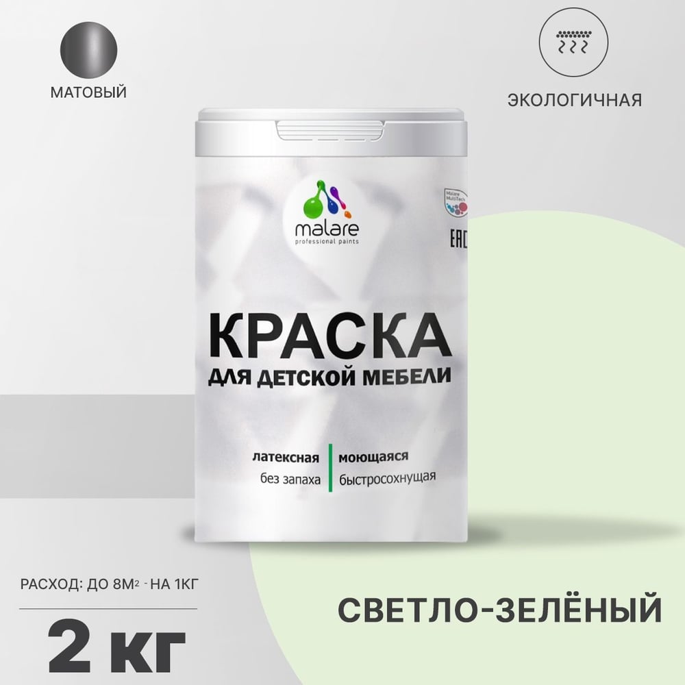 Акриловая краска MALARE для детской мебели для кухонных фасадов, мебели из дерева, моющаяся, быстросохнущая без запаха матовая, светло-зеленый, 2 кг. КДТМБАСВЗМ0200