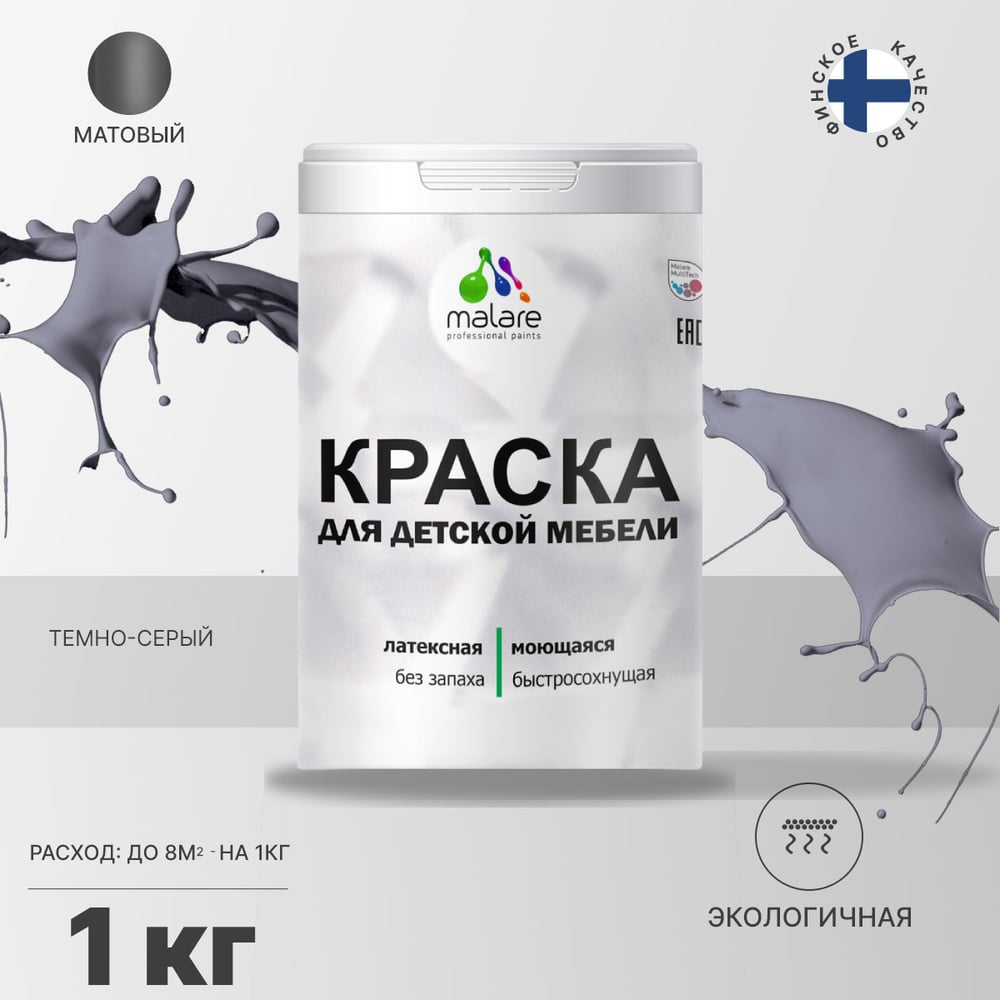 Акриловая краска MALARE для детской мебели для кухонных фасадов, мебели из дерева, моющаяся, быстросохнущая без запаха матовая, темно-серый, 1 кг. КДТМБАТЕСМ0100