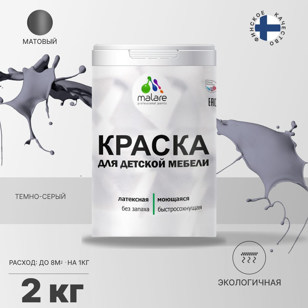Акриловая краска MALARE для детской мебели для кухонных фасадов, мебели из дерева, моющаяся, быстросохнущая без запаха матовая, темно-серый, 2 кг. КДТМБАТЕСМ0200