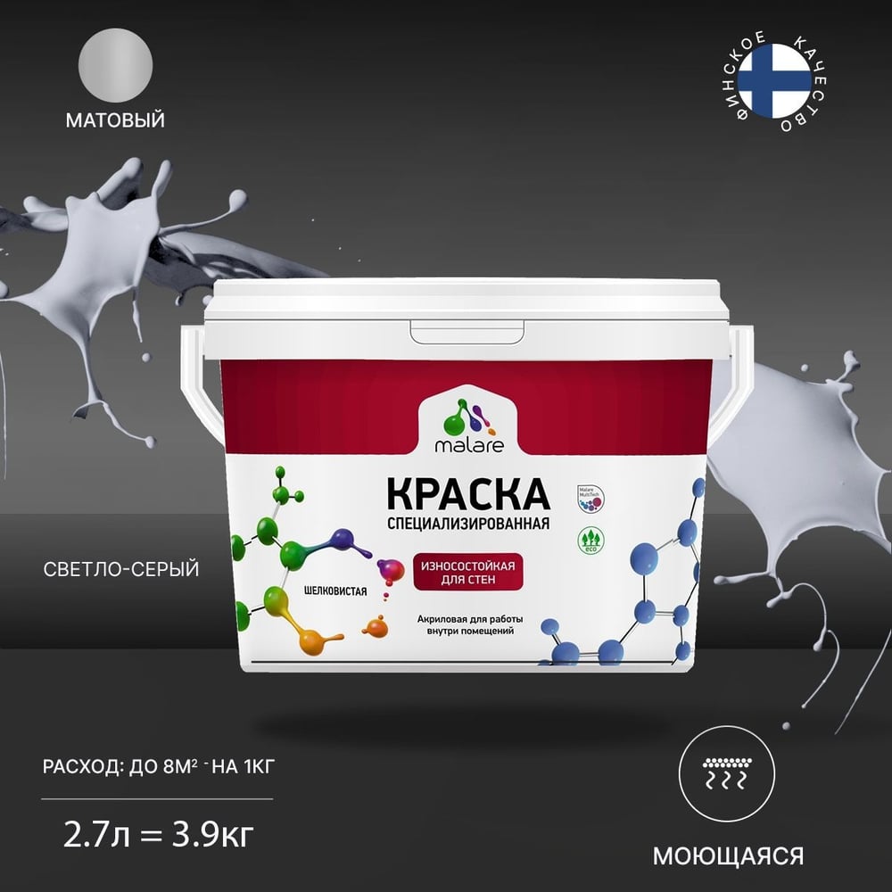 Краска Professional ИЗНОСОСТОЙКАЯ для стен и обоев MALARE светло-серый, 2.7л КРЗСТНТСВСМ0390