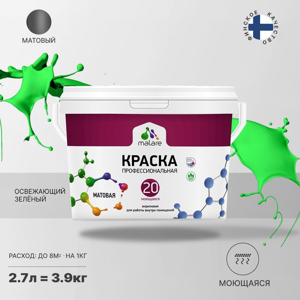 Краска MALARE Евро 20 для стен, потолков и обоев, освежающий зеленый, 3,9 кг КЕВРО20ОСЗМ0390