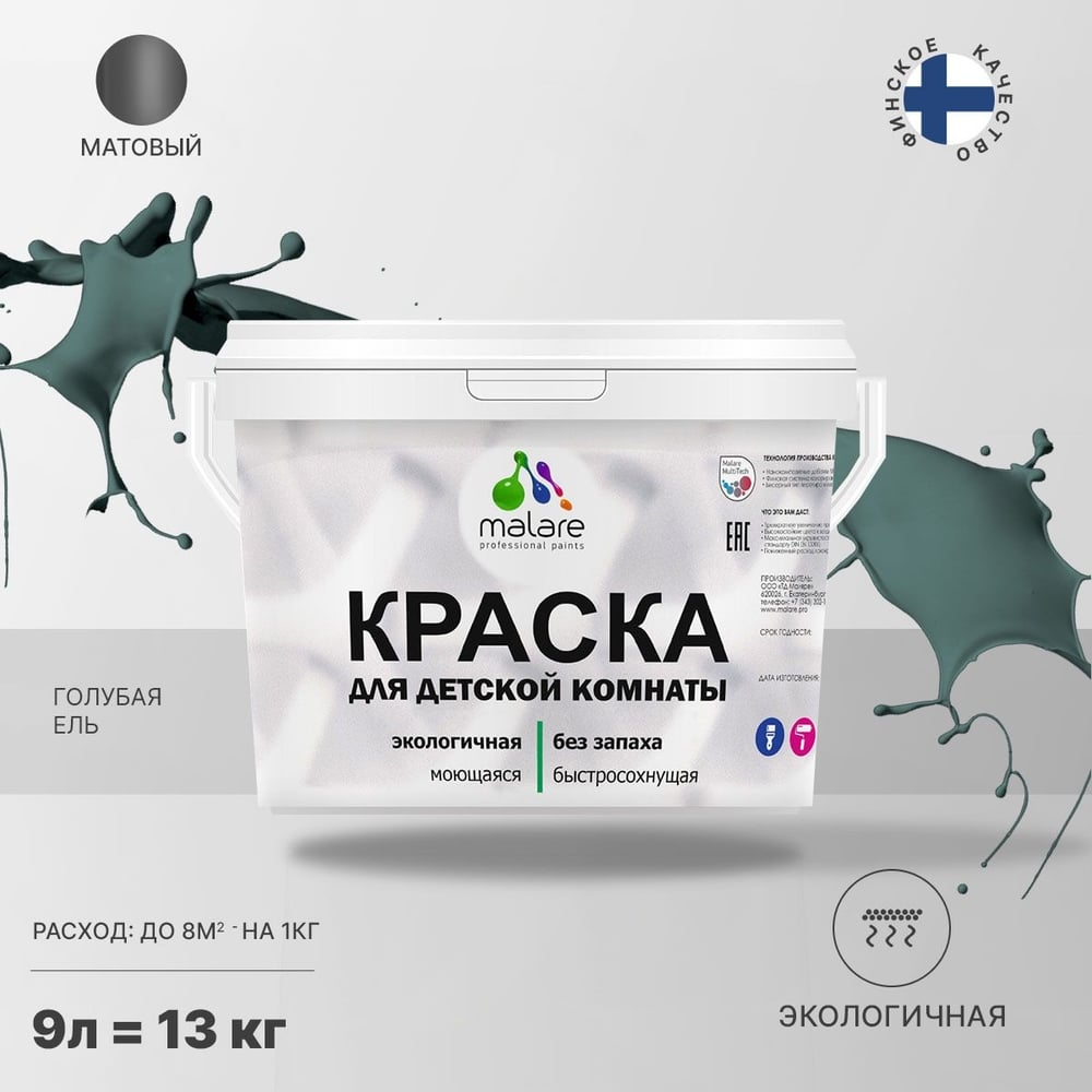Краска MALARE интерьерная для детской комнаты, моющаяся, голубая ель, 13 кг КДЕТГОЕМ1300
