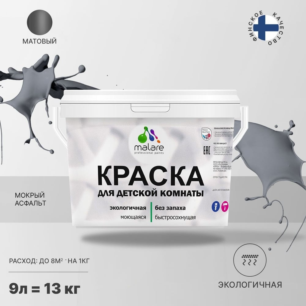 Краска MALARE интерьерная для детской комнаты, моющаяся, мокрый асфальт, 13 кг КДЕТМОАМ1300
