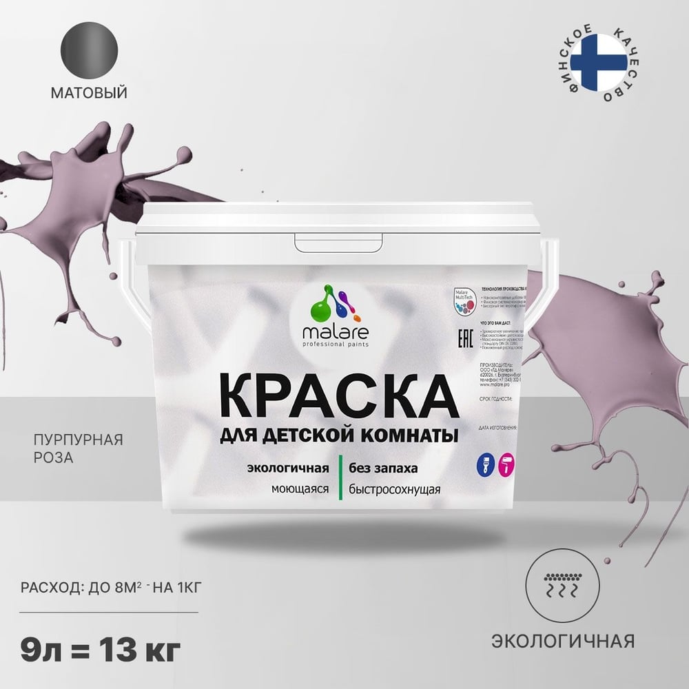 Краска MALARE интерьерная для детской комнаты, моющаяся, пурпурная роза, 13 кг КДЕТПУРМ1300