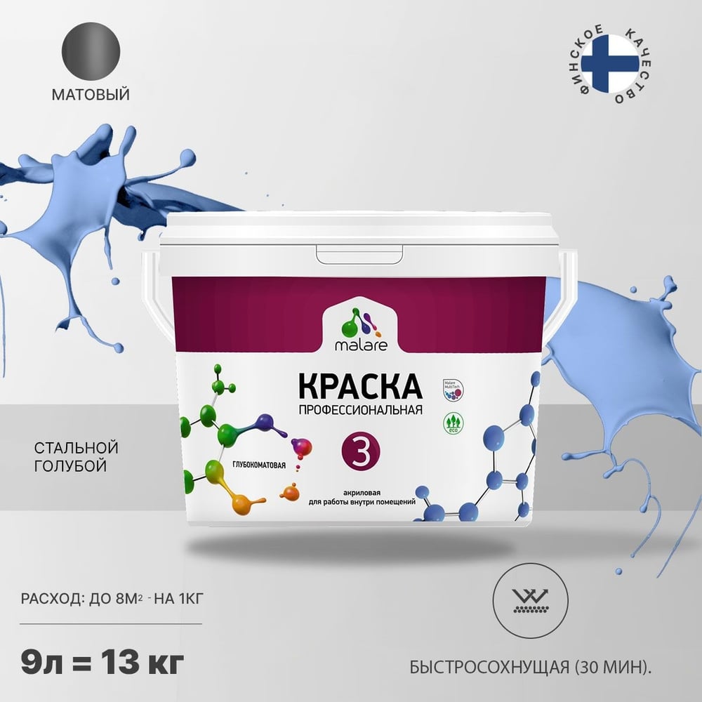 Краска для обоев, стен и потолков MALARE Евро №3, стальной голубой, 9 л КЕВРО3СТГМ1300