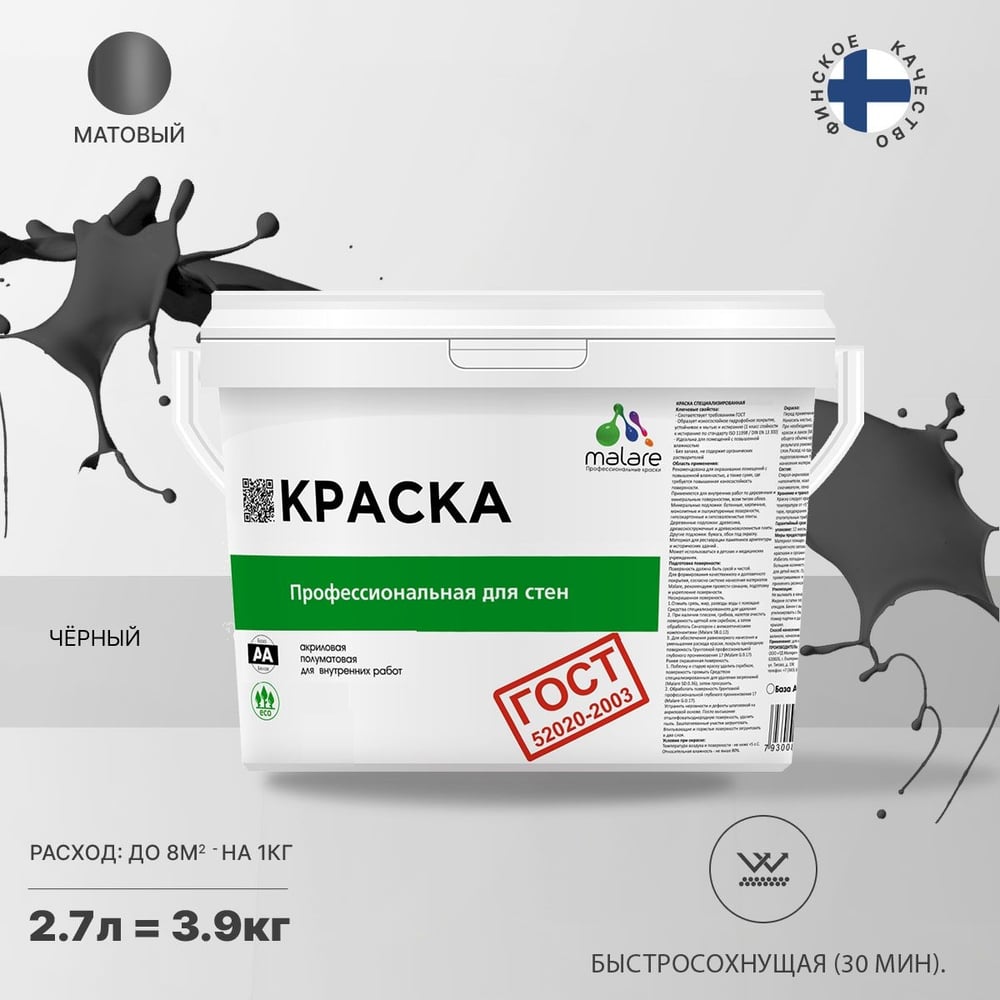 Краска для стен и потолков в сухих помещениях MALARE ГОСТ (черный; 2.7 л) 2036770245103