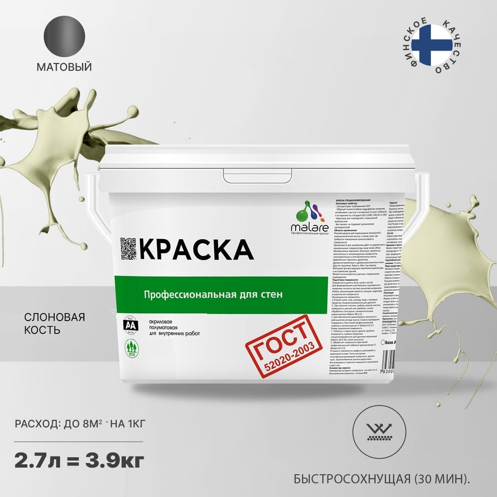 Краска для стен и потолков в сухих помещениях MALARE ГОСТ (слоновая кость; 2.7 л) 2036768243302