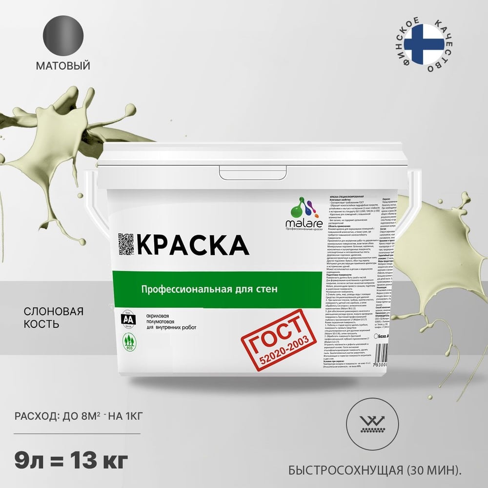 Краска для стен и потолков в сухих помещениях MALARE ГОСТ (слоновая кость; 9 л) 2036770245219