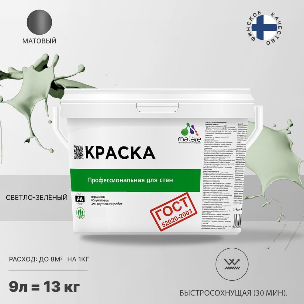 Краска для стен и потолков в сухих помещениях MALARE ГОСТ (светло-зеленый; 9 л) 2036768243043
