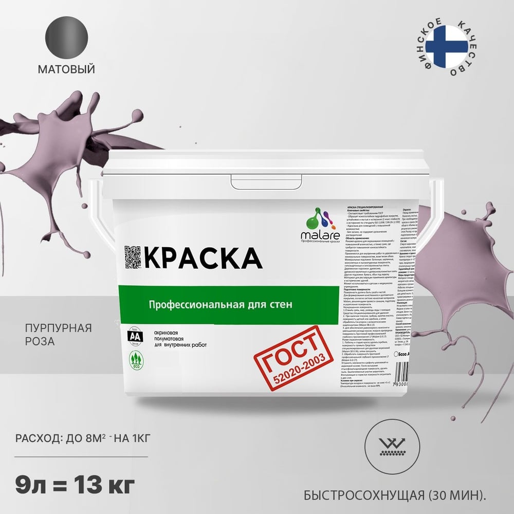 Краска для стен и потолков в сухих помещениях MALARE ГОСТ (пурпурная роза; 9 л) 2036768243333