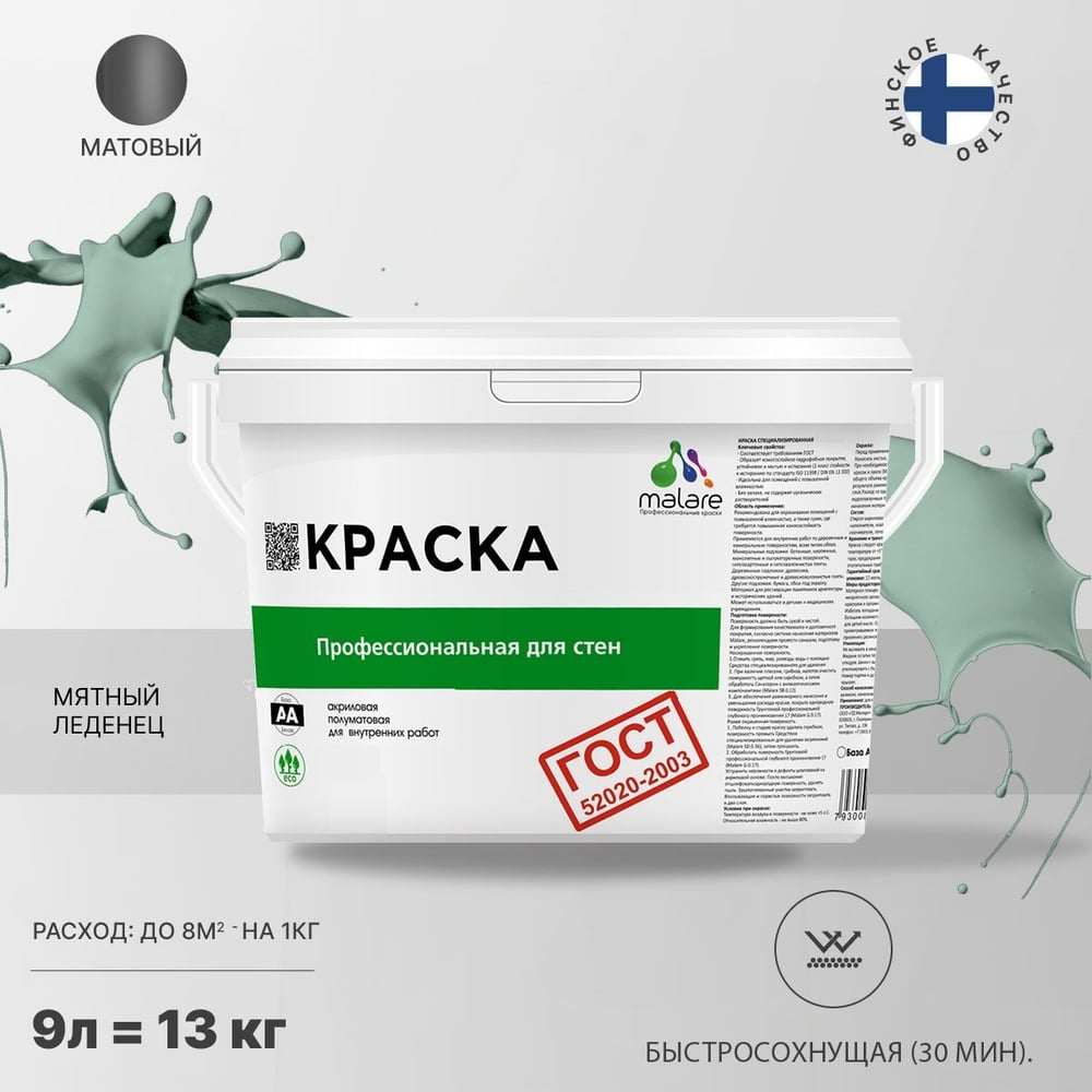 Краска для стен и потолков в сухих помещениях MALARE ГОСТ (мятный леденец; 9 л) 2036768243104