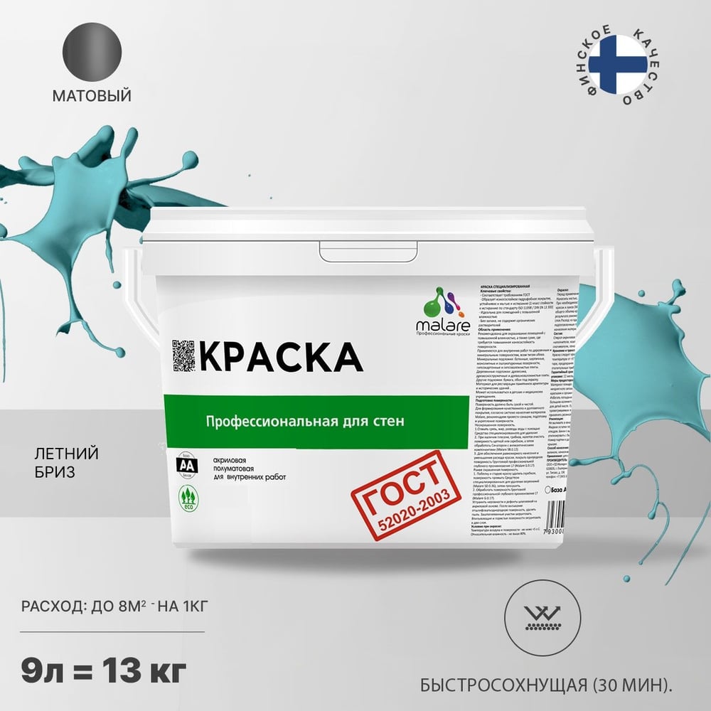 Краска для стен и потолков в сухих помещениях MALARE ГОСТ (летний бриз; 9 л) 2036767661527