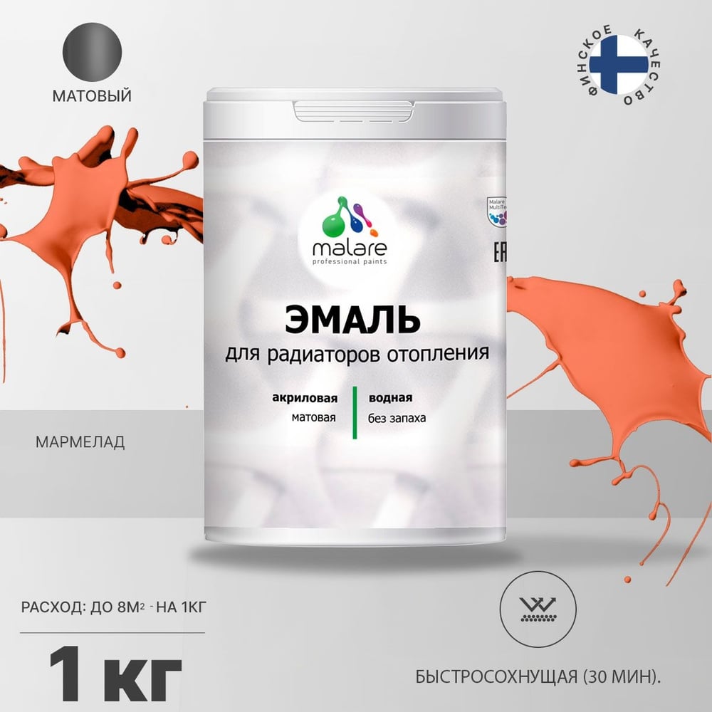 Эмаль EcoCorr MALARE для труб и радиаторов отопления, для батарей, водная акриловая без запаха матовая, мармелад, 1 кг ЭЭКОМАРМ0100
