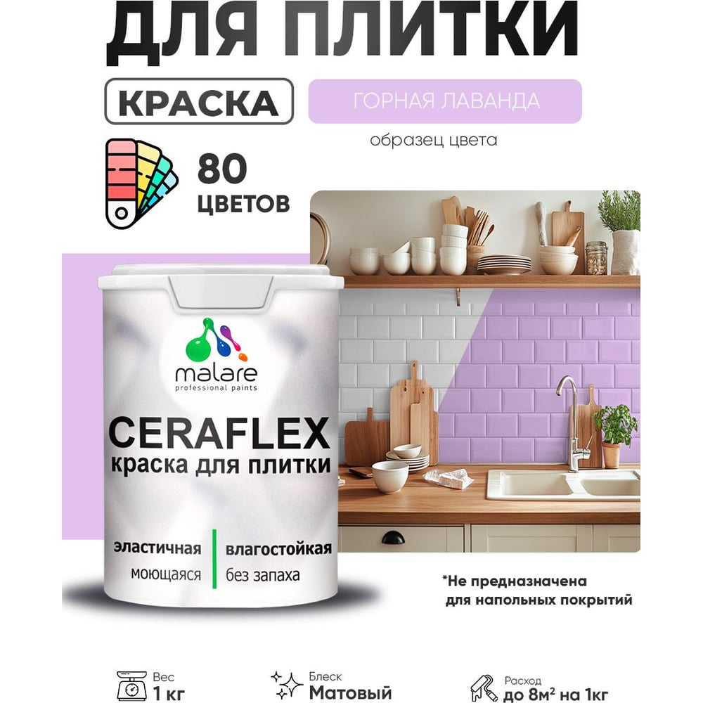 Краска акриловая MALARE Ceraflex для плитки, горная лаванда, матовый, 1 кг ККРФЛКСАГОРМ0100