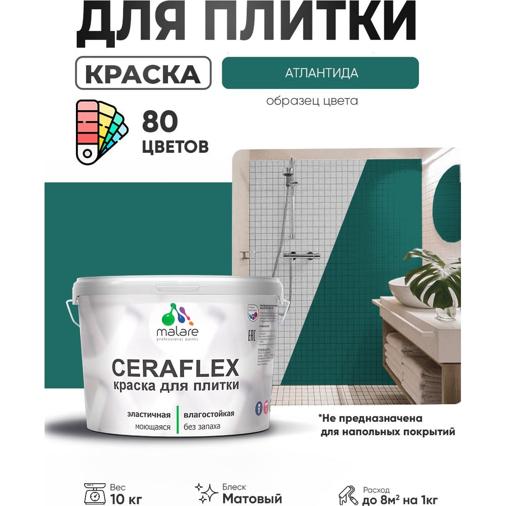 Краска акриловая MALARE Ceraflex для плитки, атлантида, матовый, 10 кг ККРФЛКСААТЛМ1000