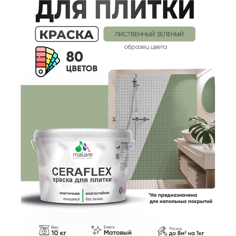 Краска акриловая MALARE Ceraflex для плитки, лиственный зеленый, матовый, 10 кг ККРФЛКСАЛИЗМ1000